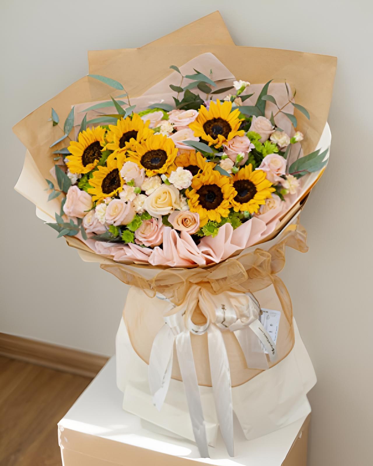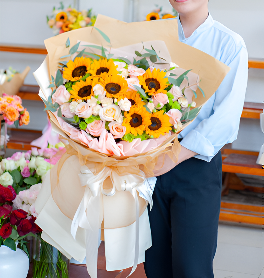 Bó hoa hướng dương và hồng kem này là sự kết hợp giữa năng lượng rực rỡ và sự nhẹ nhàng tinh tế. Hướng dương tượng trưng cho sự lạc quan, trong khi hồng kem biểu lộ vẻ đẹp thanh khiết. Bao bọc bởi lớp giấy gói kraft đơn giản cùng ruy băng màu kem, bó hoa trở thành món quà hoàn hảo, mang thông điệp của niềm vui và sự tinh tế.