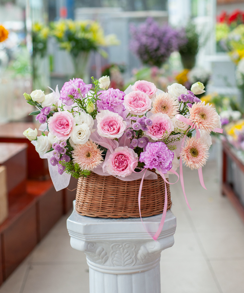 Giỏ hoa ” Ngọc Hương” mang đến vẻ đẹp thanh thoát và sang trọng, như lời cảm ơn dịu dàng gửi đến những người phụ nữ truyền cảm hứng trong cuộc sống. Từng bông hồng Lạc Thần kiêu sa, điểm xuyết cẩm chướng tím và cát tường trắng tinh khôi, tạo nên bức tranh hoa đầy cảm xúc. Đây là món quà hoàn hảo cho dịp 8/3 – nơi yêu thương được thể hiện bằng sự tinh tế và trân trọng nhất.