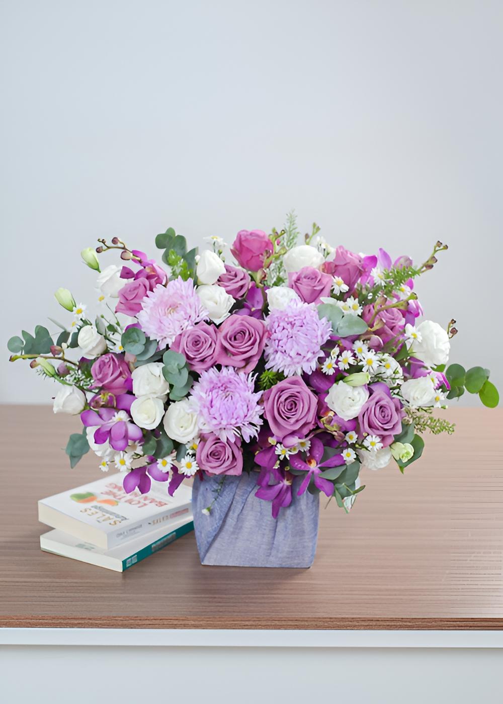 Hộp hoa tươi “Mộng Huyền” mang vẻ đẹp huyền ảo và thanh nhã, như làn hương dịu của tình yêu trong buổi sớm mai. Sắc tím tượng trưng cho sự thủy chung, sang trọng và sâu lắng, kết hợp tinh tế giữa lan Moka, hồng cà và cát tường trắng. Đây là món quà tuyệt vời để bày tỏ cảm xúc – vừa đủ kiêu sa, vừa đủ mềm mại, khiến người nhận cảm nhận được sự trân trọng và tinh tế trong từng chi tiết.