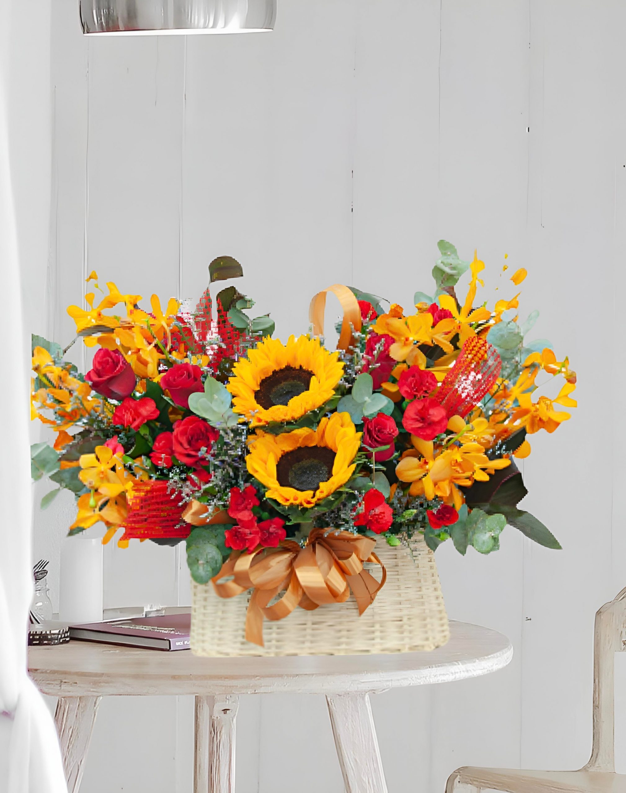 Bó hoa “Hồng Dương” là biểu tượng của tình yêu nồng nàn và ánh sáng hy vọng. Sắc đỏ rực rỡ của hồng sa và cẩm chướng chùm hòa quyện cùng sắc vàng tươi của hướng dương và lan Moka, tạo nên một tổng thể mạnh mẽ nhưng vẫn tinh tế. Đây là món quà lý tưởng dành tặng người bạn yêu thương hoặc những ai truyền cảm hứng cho bạn – như lời chúc về niềm tin, đam mê và hạnh phúc tỏa sáng.