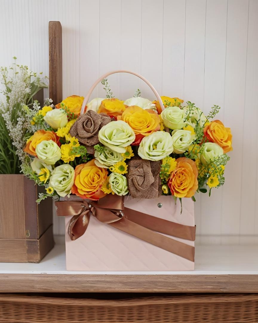 Giỏ hoa tươi “Kim Hạ” gợi cảm giác ấm áp như ánh nắng mùa hè phủ đầy niềm vui và sự sống. Tông vàng chủ đạo tượng trưng cho may mắn, kết hợp với viền đỏ rực rỡ của hồng vàng viền đỏ và điểm nhấn xanh tươi từ cát tường, mang đến vẻ đẹp vừa sang trọng vừa thân thiện. Đây là món quà hoàn hảo để gửi lời chúc tươi sáng, khích lệ và tràn đầy hy vọng đến người nhận.