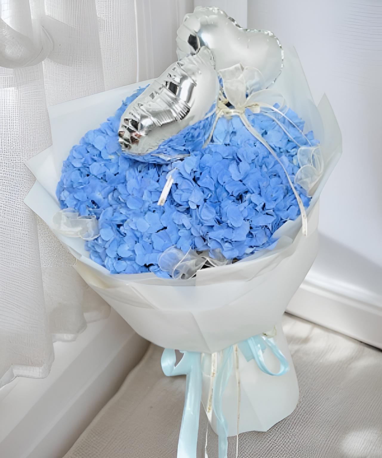 Bó hoa “Lam Ngân” là sự hòa quyện tinh tế giữa sắc xanh trong trẻo và ánh bạc hiện đại, mang đến cảm giác sang trọng mà vẫn tươi trẻ. Sáu bông cẩm tú cầu xanh dương bung nở tròn đầy, tượng trưng cho niềm tin, sự gắn bó và lời chúc may mắn. Bó hoa là lựa chọn hoàn hảo để dành tặng người yêu, người bạn đời hoặc chính bản thân – như một lời nhắn gửi: “Tình yêu của chúng ta luôn bền vững và sáng trong như sắc lam ánh bạc này.”