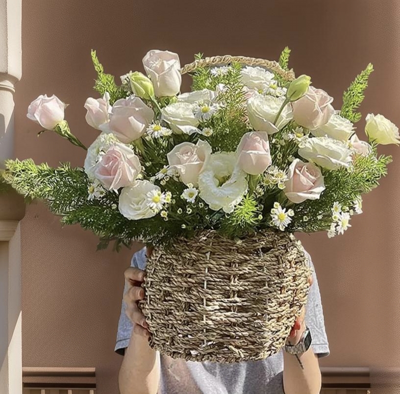 Giỏ hoa Nguyện Ước Hồng mang vẻ đẹp dịu dàng, thanh thoát với sắc hồng kem nhẹ nhàng của hoa hồng kết hợp cùng nét mềm mại của cát tường. Điểm xuyết thêm thạch thảo trắng và lá đuôi chồn, giỏ hoa là lời chúc ngọt ngào, chứa đựng những ước mong tốt đẹp gửi đến người nhận